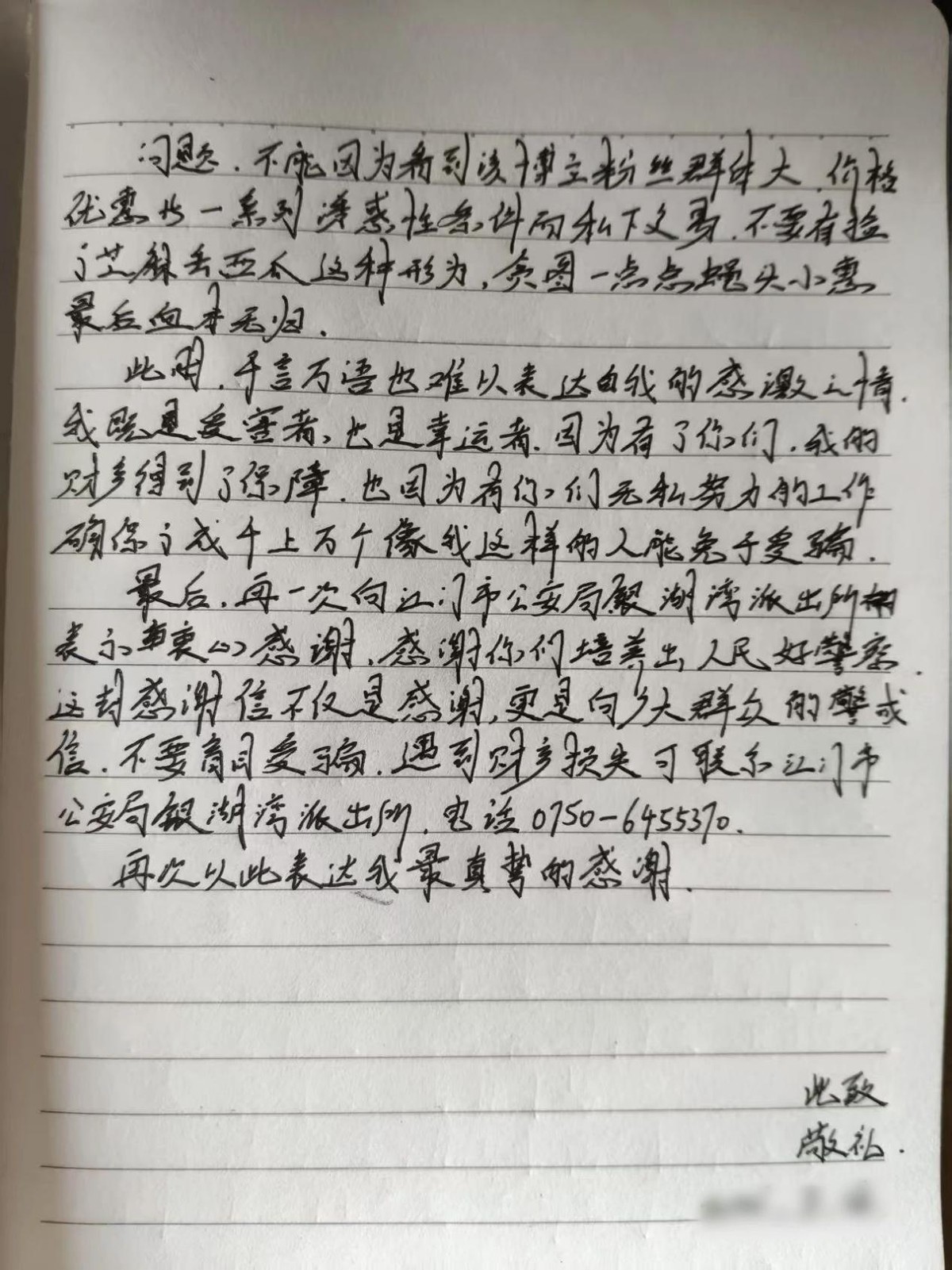 近日,江门新会银湖湾派出所收到,一封手写感谢信,“衷心感谢警察同志,帮我挽回了损失!此次教训也警示了我,莫贪小利,以免遭大损。”
