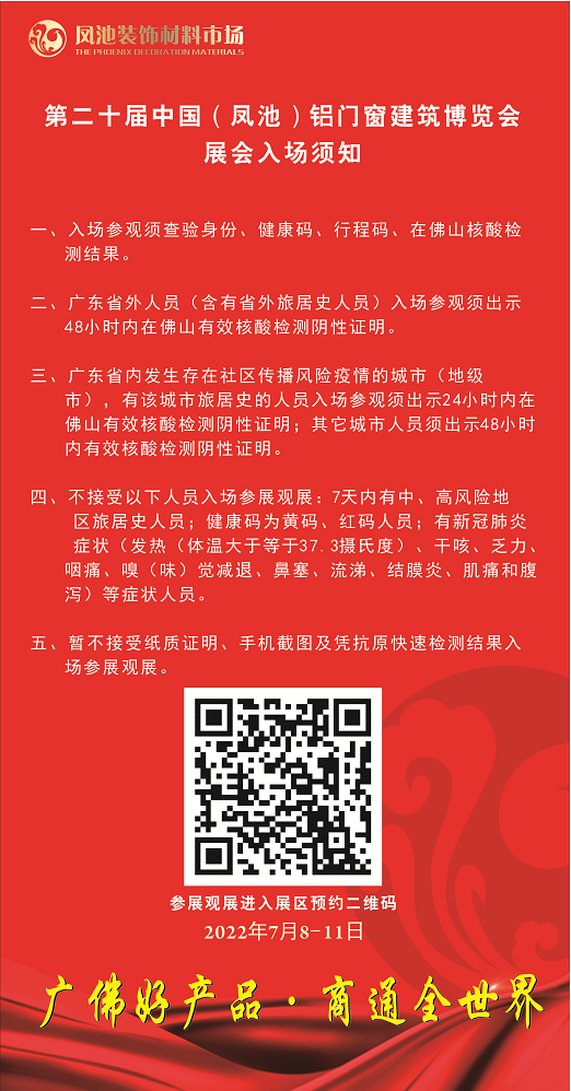 中国(凤池)铝门窗建筑装饰博览会创办于2012年,是依托佛山最大门窗建材专业市场举办的第一个门窗装饰材料展,主要展销建材中的门窗、铝型材、五金及相关配件产品。目前,已形成了“一年三展”——3月、7月及10月的规模,每年都能吸引大量来自全国各地行业大咖、客商及行家参与,是引领整个铝产业链转型升级、赢取商机的晴雨表及风向标。
