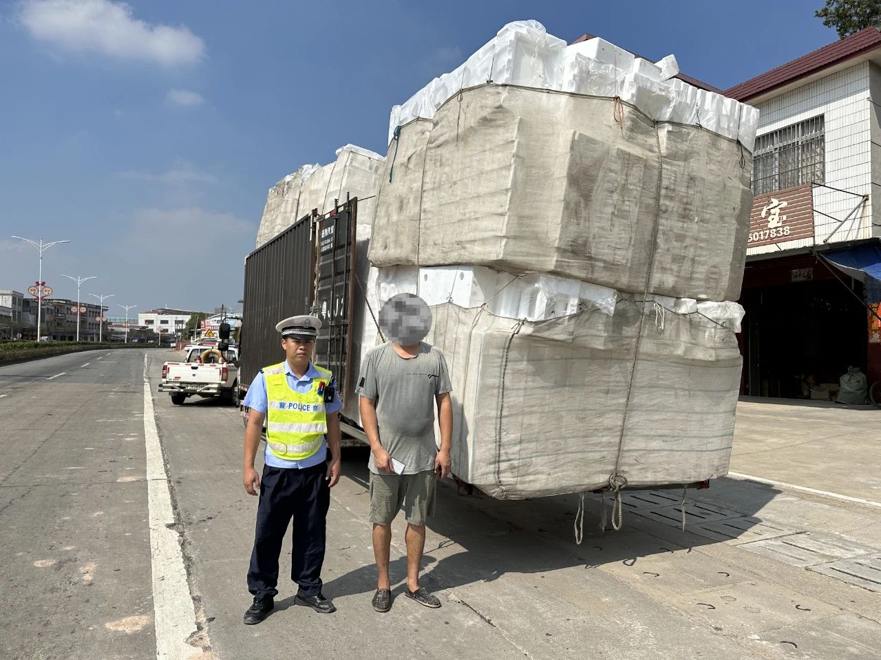 近日,新会交警在执勤期间查处一起货车载物超限的交通违法行为,驾驶人冒险驾驶“变形金刚”行驶在道路上,远远望去犹如一堵行走的“白墙”,占据了大半条道路,隐患重重,幸