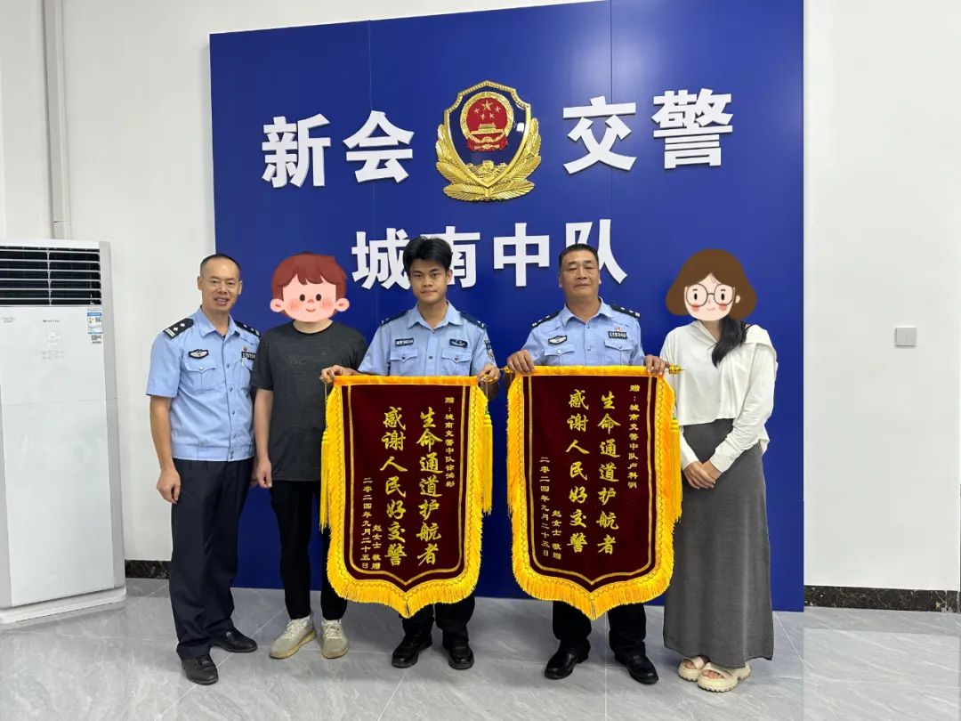 近日,赵女士怀着满心感激之情,来到新会公安交警大队城南中队,送上一面印有“生命通道护航者 感谢人民好交警”的锦旗,对民警辅警深夜的暖心救助表示衷心感谢。这一温馨场景